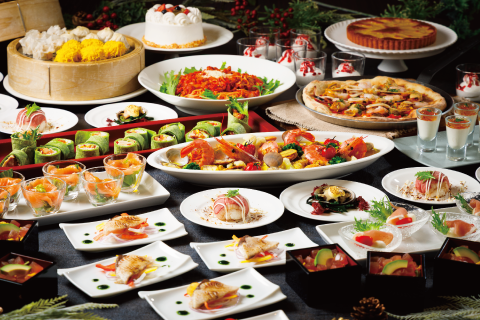 | 内容 | ○ ブッフェ料理( 冷製料理・温製料理・デザートなど約35種 ) ♦国産牛のローストビーフ マッシュポテト(金・土曜日) ♦国産牛ステーキ ドフィノア(日・月・火曜日) ♦海老の串焼き ハーブ風味 ♦鶏の串焼き エスニック風 ♦スモークサーモンの升寿司 など ○ アルコール&ソフトドリンク飲み放題 |