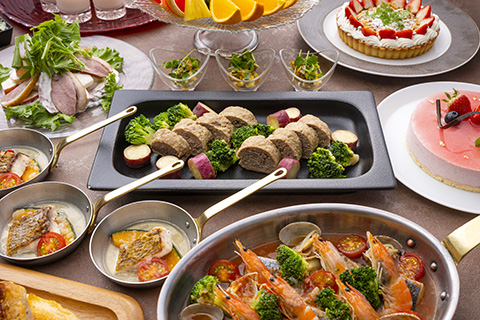 | 内 容 | 月替わりのメイン料理はライブキッチンで出来立てを食べ放題にてお楽しみいただけます。 フリーフード・サラダ・デザート・ドリンク等もビュッフェ形式です。 |