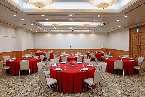 カジュアルなパーティースタイルから会議・講話など、あらゆる集いに対応する多様な宴会機能を備えたバンケットルームです。⽤途により2分割でもご利⽤いただけます。単独の有線LANを完備しており、リモート講演会にも対応致します。